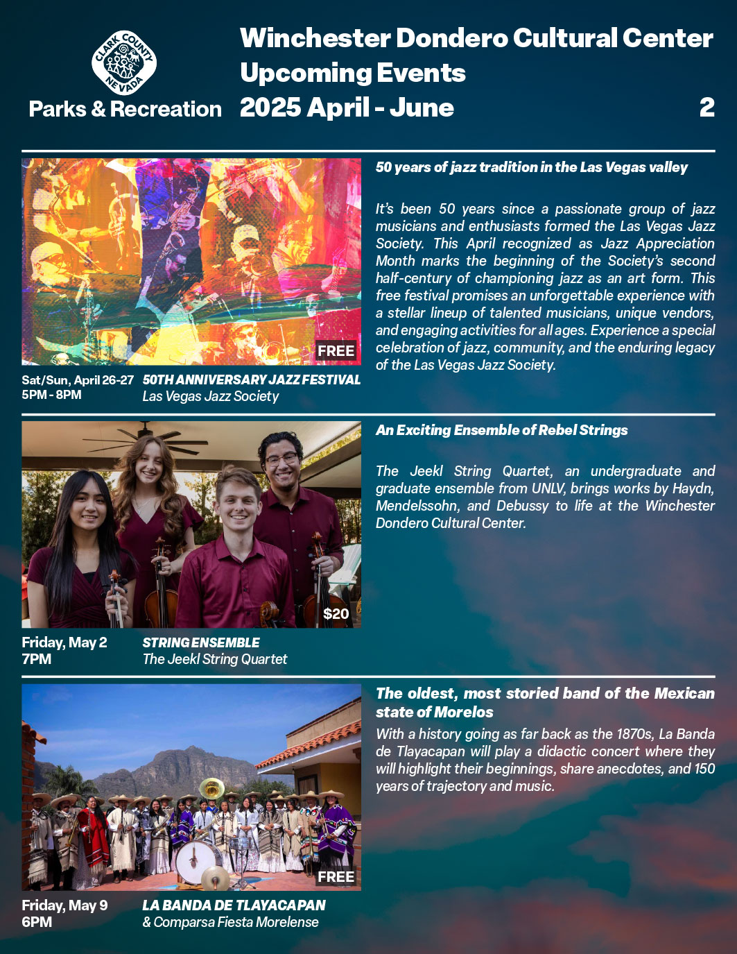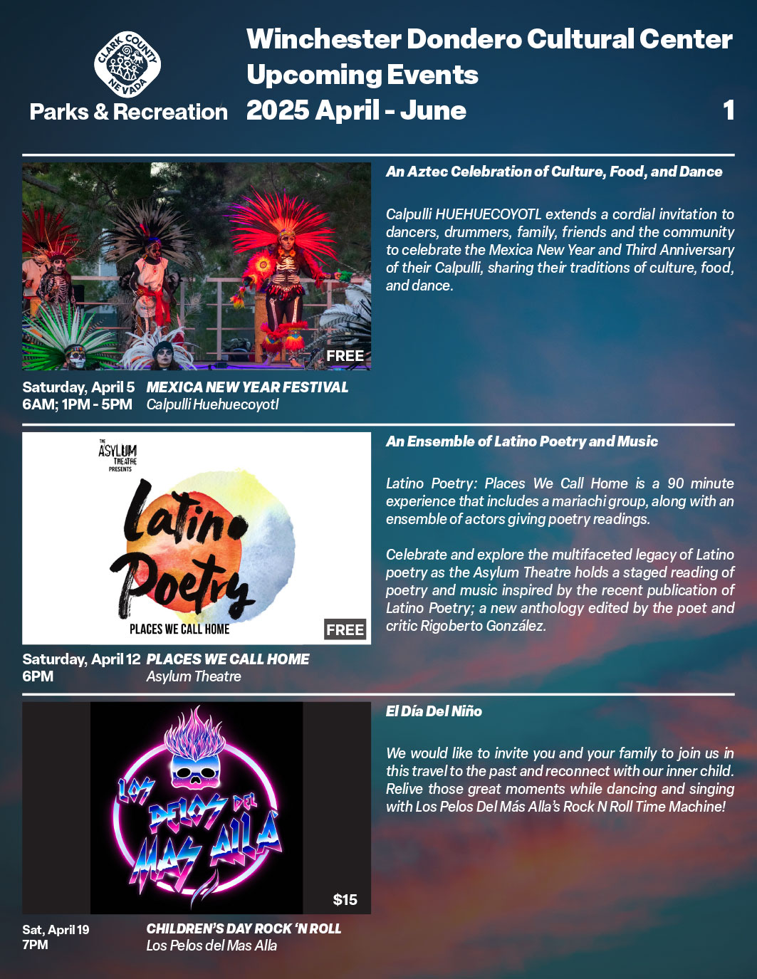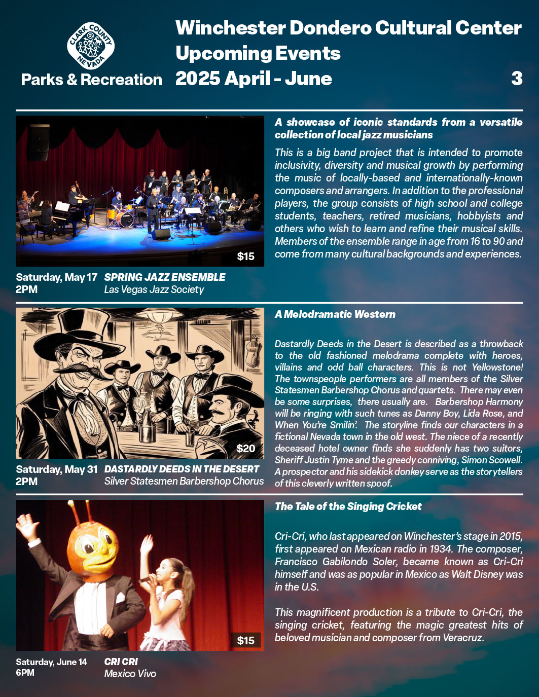 Winchester Dondero Cultural Center was dedicated on August 4, 1982 as a community center that nine years later became the only Cultural Center for Clark County. The name Dondero was added to the center, after a building expansion in 2018, to honor late Commissioner Thalia Dondero, who was instrumental in acquiring the 8.9-acre parcel for the community on which the park and center were built. Winchester has been the heart of performing and visual arts for Clark County Parks and Recreation since 1991. Along with diverse youth and adult programming in dance, theater, fitness, poetry, music, and visual arts, the center offers a park, desert demonstration garden, skate park, theater, and art gallery. The gallery hosts ongoing exhibitions to highlight the talents of local artists while Clark County’s only indoor theater (220 seats) is home to an assortment of music, dance, and theatrical performances. Nationally known musicians, vocalists and dancers, and homegrown, youth-centered drama and dance troupes, have graced the Winchester Theater stage which is the art beat of Southern Nevada.