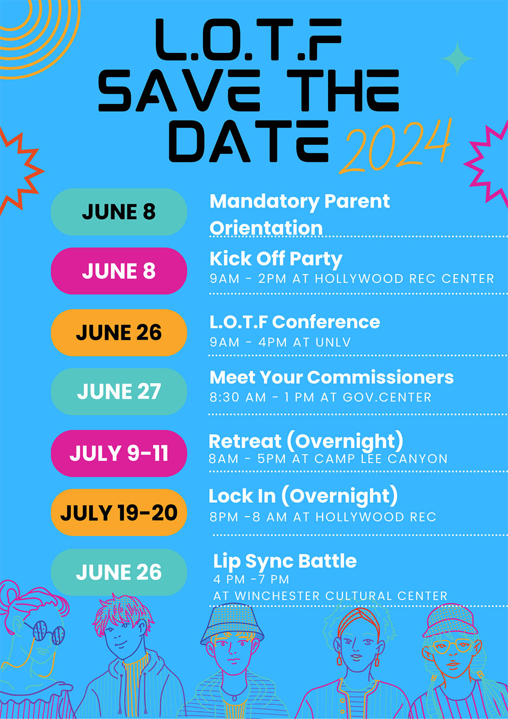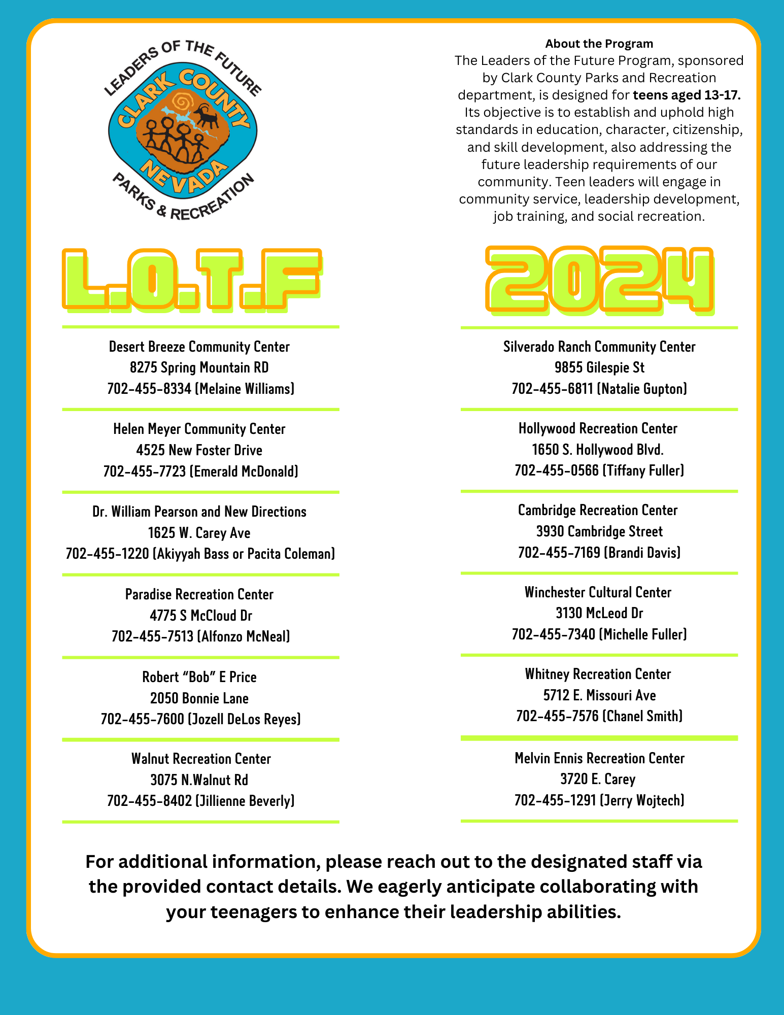The Leaders of the Future program is sponsored by the Clark County Department of Parks and Recreation for teens 13-17 years of age. The objective of the program is to create and maintain high standards of education, character, citizenship, and skill development to meet the future leadership needs of the community. Teen Leaders will focus on service to the community, leadership development, job training, and social recreation.